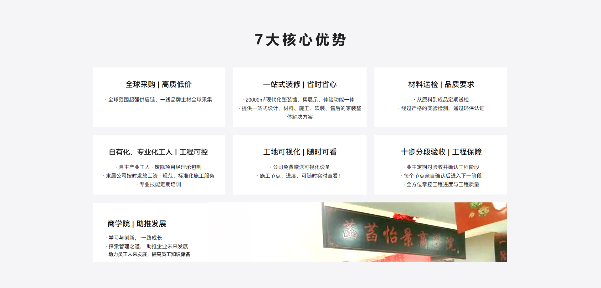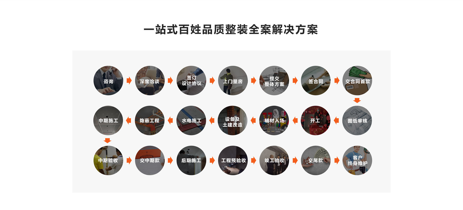 每個(gè)工作人員都需通過公司專業(yè)系統(tǒng)培訓(xùn)后上崗,從設(shè)計(jì)、簽約、選材、施工到交付,服務(wù)全過程保障